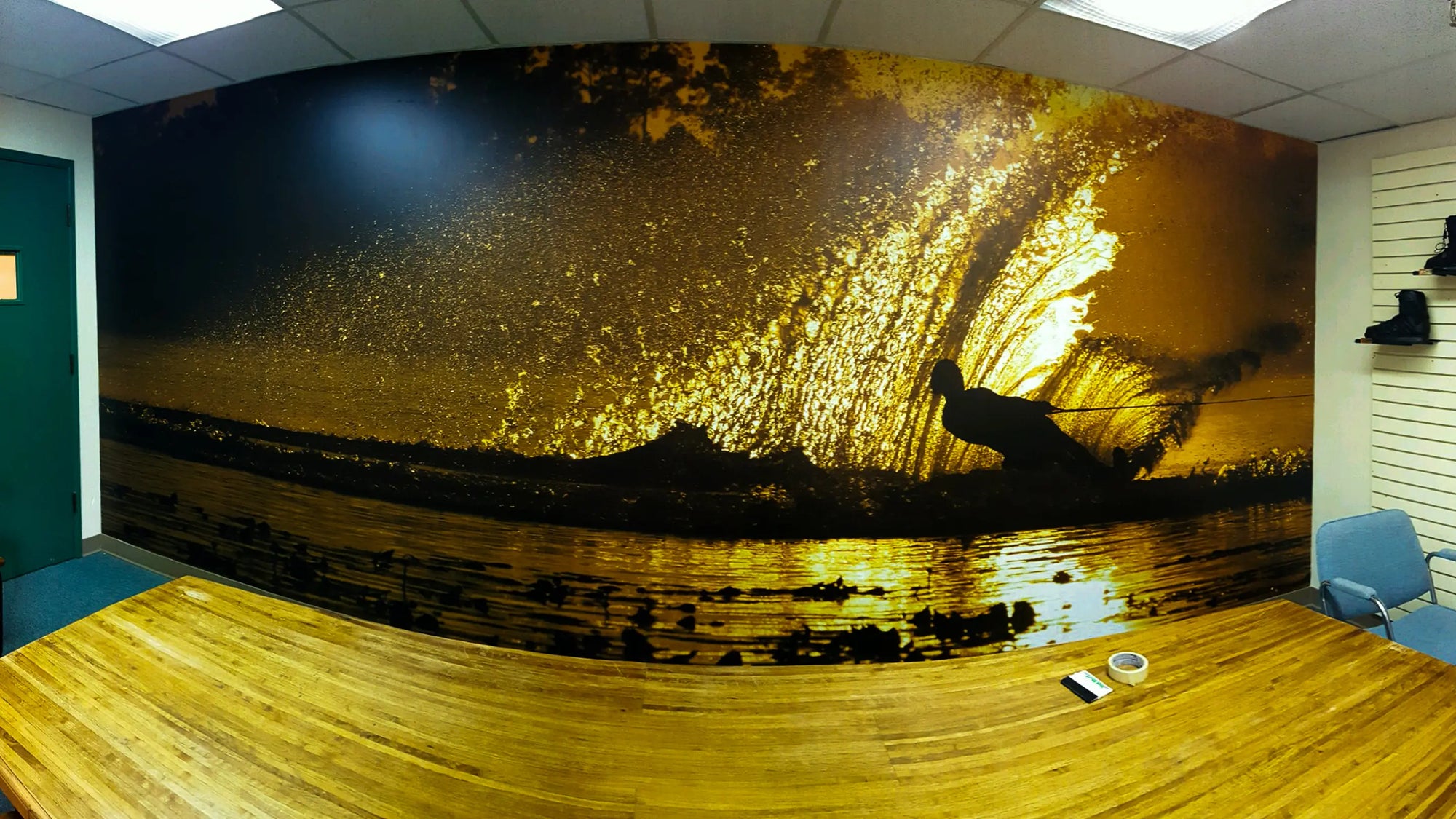 This is a large black and white wall mural we printed and installed at the Connelly Watersports Headquarters in Lynnwood, WA.